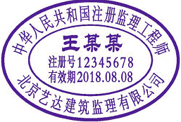 (一)中華人民共和國注冊監(jiān)理工程師執(zhí)業(yè)印章印模顏色為紫色。由:中華人民共和國注冊監(jiān)理工程師、姓名、注冊號、有效期和聘用企業(yè)名稱五部分組成。