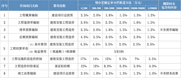 8、工程概算、工程量清單、清單預(yù)算、定額預(yù)算、竣工決算的審核費用,按照本表所對應(yīng)的咨詢項目編制費率的90%計取費用;